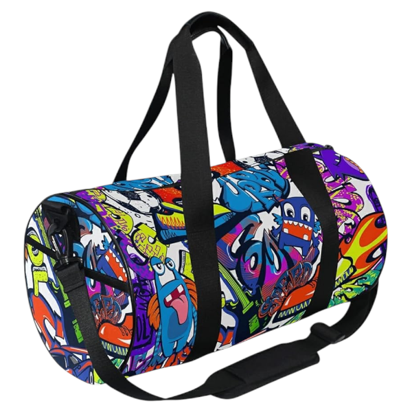 Graffiti print cylinder bags is made of durable nylon fabric, water-resistant surface and linings with good breathability. Tote travel bag has been well stitched and reinforced at all stress points, and the zipper opens and closes smoothly. And sports duffle bag uses light and waterproof cloth, which is very suitable for travel and daily use.