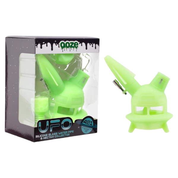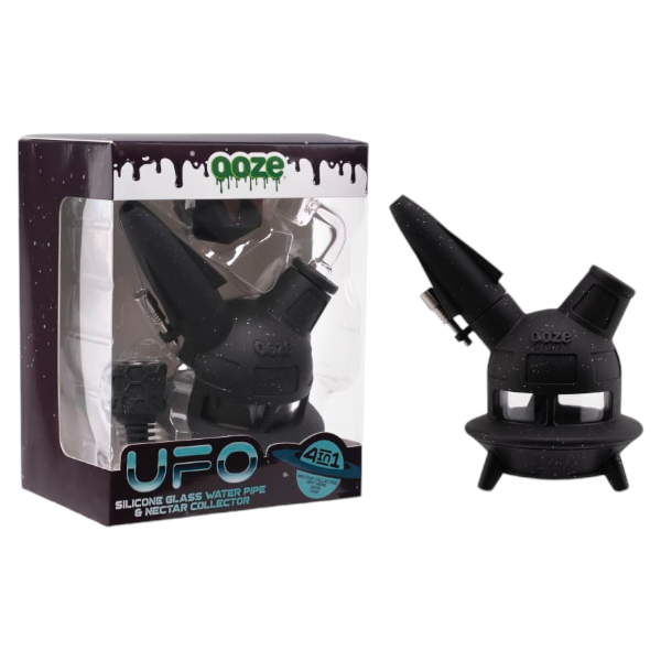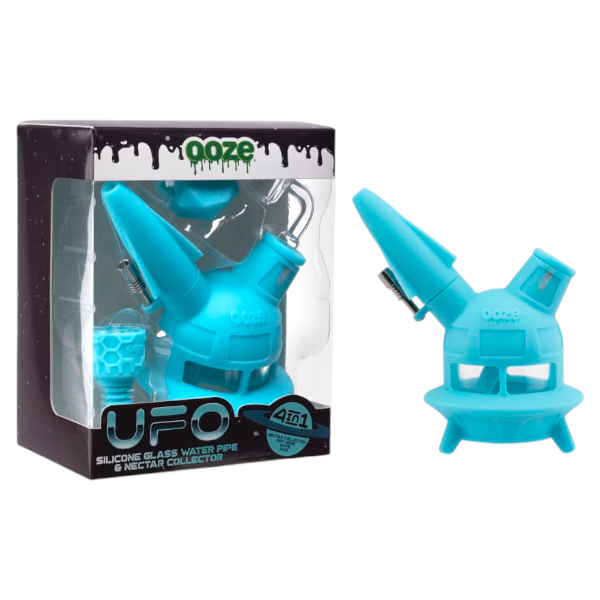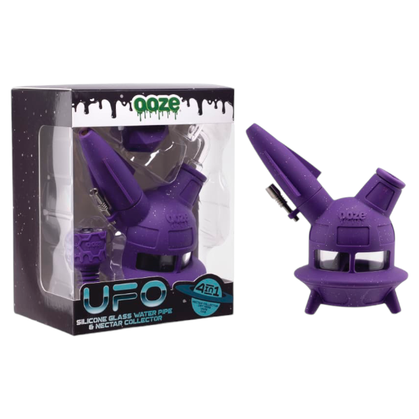 This hybrid piece has 4 distinct functions: a bong, dab rig, dab straw, and Ooze vape pen adapter (battery sold separately). Each package includes an Ooze Armor Bowl, thermal banger, titanium nail, and a matching Geode silicone glass stash jar for concentrates. The UFO comes apart completely for easy cleaning, and is dishwasher safe.