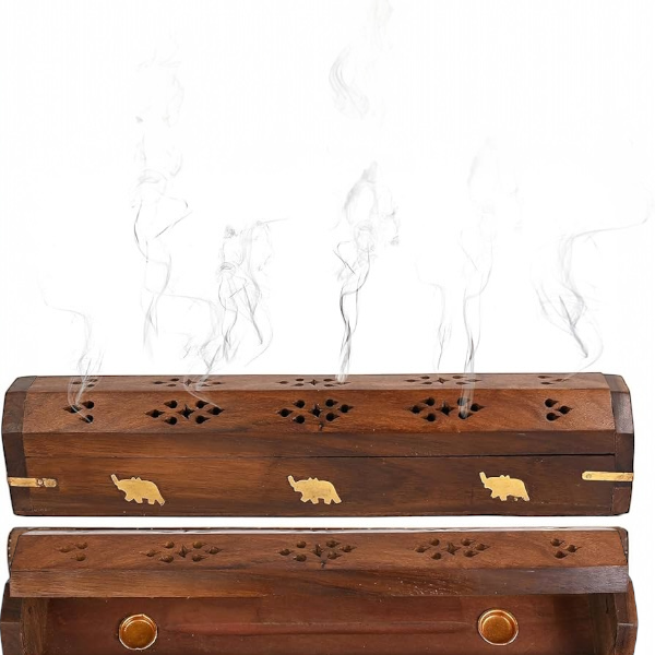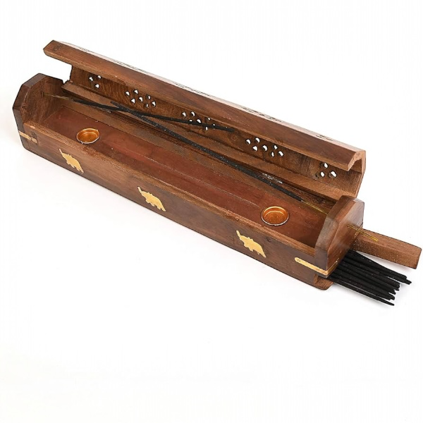 Natural look, hand-carved wooden incense box decorated with brass on flowers on its side walls. This incense box burner comes in a brown wooden look and large enough to accommodate your various sizes of incense sticks. With 12″ length, this incense holder will contain the whole incense sticks making sure no ashes fall outside. Unlike other incense holders, this wooden holder will catch 100% of the ash.